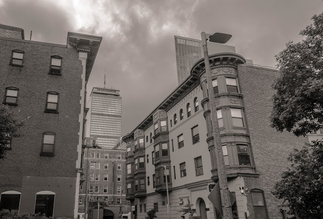 I'm a sucker for the effect of isolating one bit of color in a black and white shot-- I think it mostly works, though when the color really stands out in real life too. That was the case here - I didn't have to remove very much color--the day and the street was very monochrome and the purple truly did stand out.