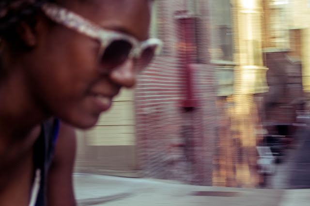 I really like this photo-- my neighbor Selena was riding past on her bike real close to me and I just turned and took a quick shot. I think it might be the sunglasses, but there's a real colorful summer quality to it.